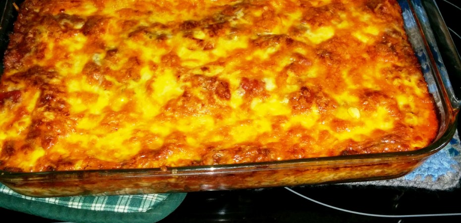 1 Pound Hamburger 1 package of Spaghetti Seasoning… however I use my own recipe and you can get my Spaghetti Seasoning Mix HERE 1 can Tomato Sauce 1 can Stewed Tomatoes (you can use plain OR a can of “Italian Seasoned Stewed Tomatoes”) Olive Oil Lasagna Noodles ( I used 12) Mozzarella Cheese Ball, grated / Cheddar Cheese, grated /Parmesan Cheese (Kraft, green container) HOW TO: oven at 350° Brown Hamburger. Drain Fat. Add Spaghetti Seasoning, Tomato Sauce and the Stewed Tomatoes. ( I usually cut down the stewed tomatoes as the pieces are kinda big, and I’m not a huge fan of hot lumps of tomato. ) Simmer on Low for a few minutes. Start boiling a rather large pot of water. Add about 2 Teaspoons or less of Olive Oil to the water. When water reaches boiling point, add Lasagna Noodles. Boil noodles until they are almost fully cooked. Remember, they will be in the oven for about 45 minutes and will cook there as well. I usually turn off the pan of meat sauce at this point. Once the noodles are done, I rinse them in cold water. I use a colinder and leave them soaking in cold water because it’s just easier to work with cooled noodles vs hot ones. Layering the Lasagna: In the 9 X 13 Pan. Put a couple heaping serving spoons of meat sauce on the bottom. (maybe 1/2 Cup or less). Spread thinly. The next layer is the noodles: put 4 noodles down covering the long length of the pan <—–13″—->, then take 2 more noodle and cut them in half and lay them crisscross over the 4 noodles you just placed down. So now you should have 4 full noodles down and 4 half noodles over them. Using about half the meat sauce, cover the noodles. Place a layer of the 3 cheeses Mozzarella, Cheddar and sprinkle the parmesan cheese. I think i used 2 handfuls of the Mozzarella and Cheddar. Then sprinkled a thinner layer of the Parmesan. Repeat the noodle layer. Top with the remaining sauce. Repeat the cheese layer. Bake for 30 minutes at 350°. Check and if the cheese layer on top is not turning brown, i crank up the heat to 425°. (just keep an eye on it if you do turn up the temperature. It may turn brown faster than you think).HomeMade Lasagna